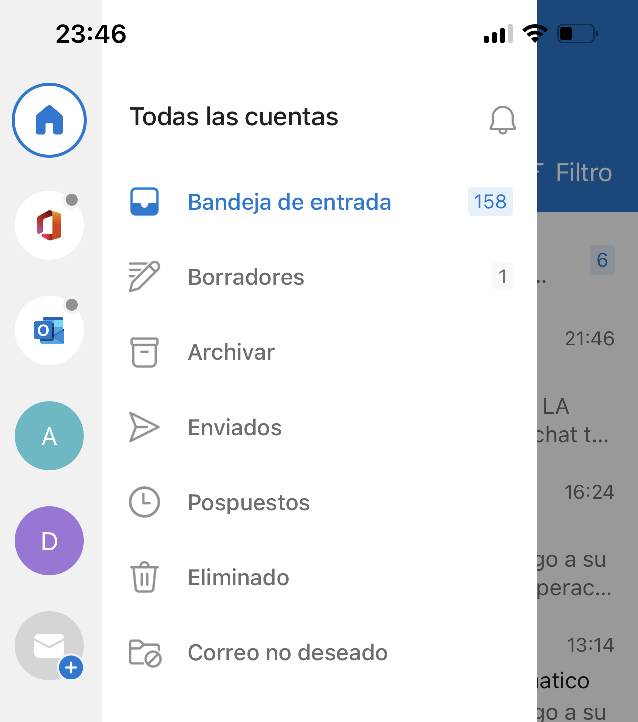 1. Abre Outlook, toca el ícono de la "casita" y luego el engranaje de configuraciones.