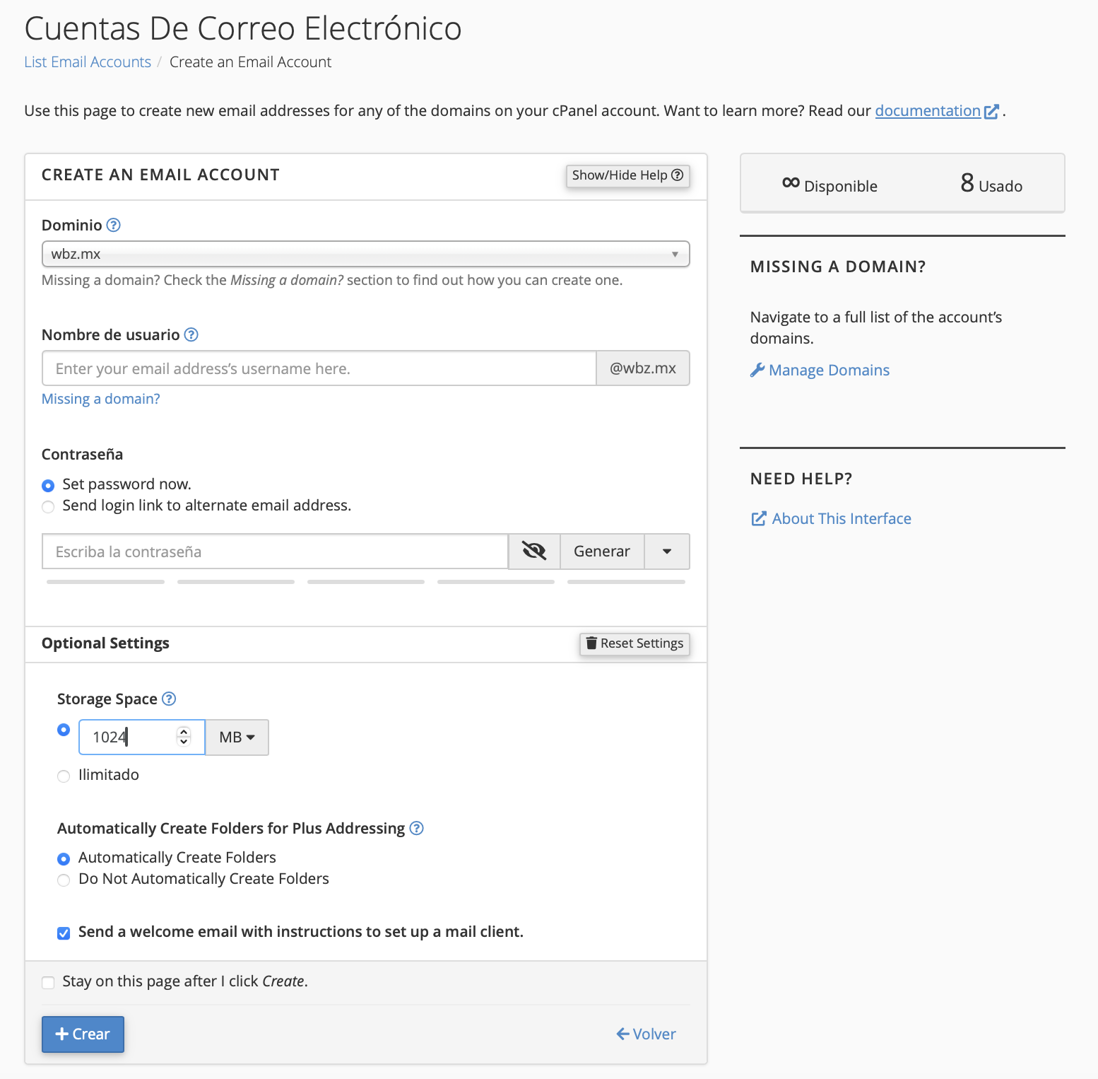 • Cuota de buzón de correo: Aquí puedes establecer un límite de almacenamiento para la cuenta de correo electrónico. Puedes dejarlo en el valor predeterminado o ajustarlo según tus necesidades.