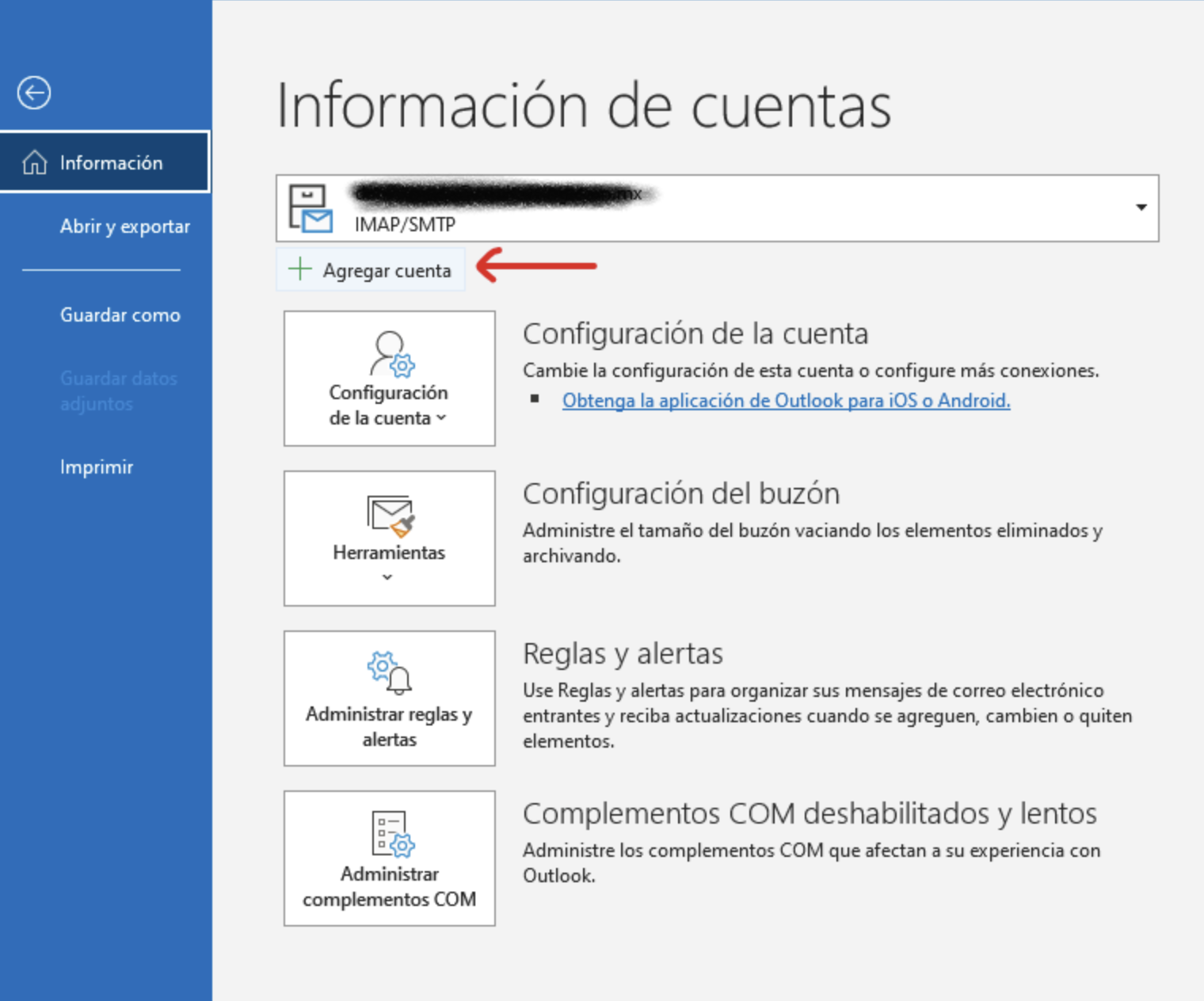 - Abre Microsoft Outlook y ve a Archivo > Agregar cuenta.