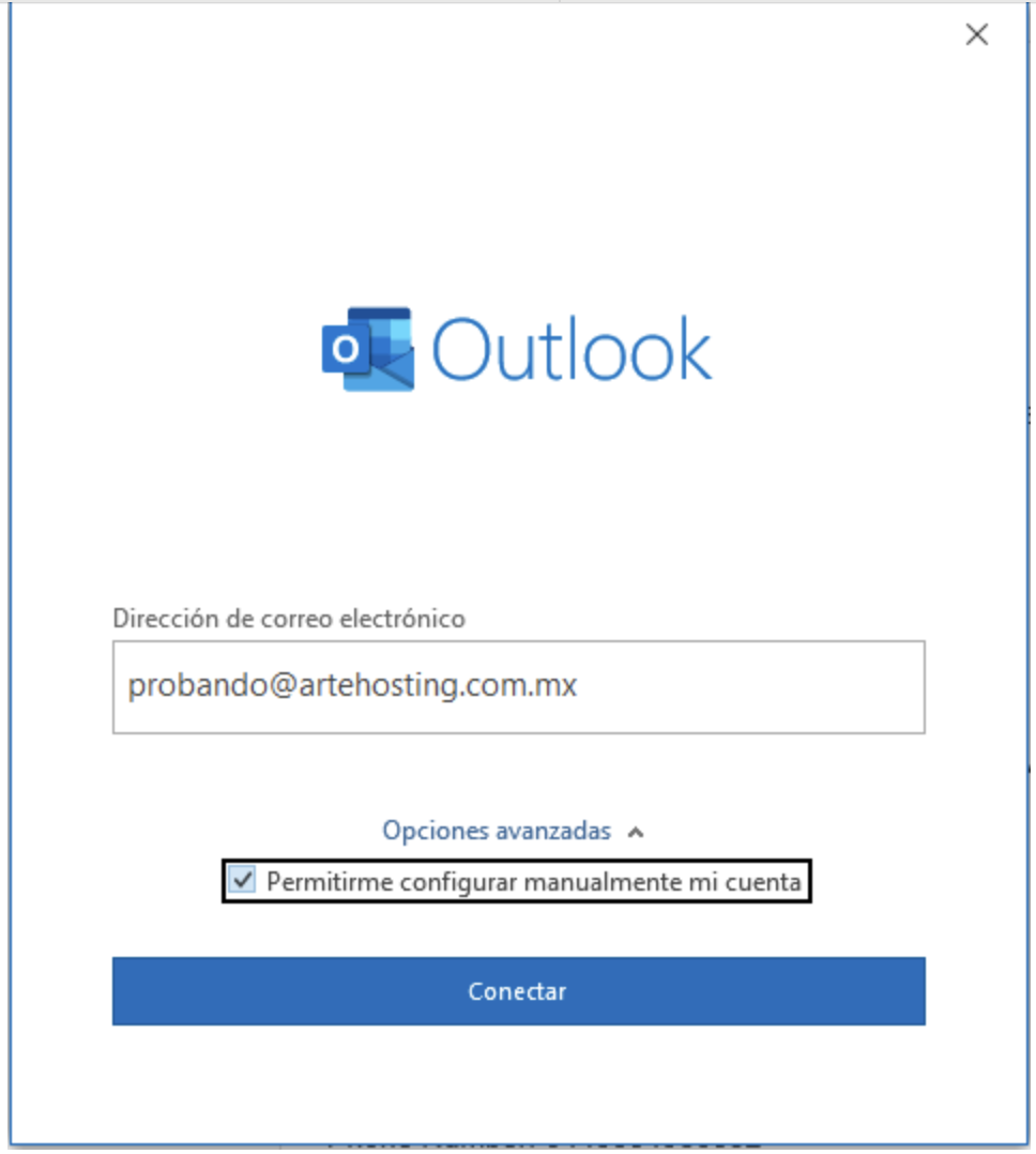 - Ingresa tu cuenta de correo electrónico y selecciona la casilla "Permíteme configurar manualmente mi cuenta".